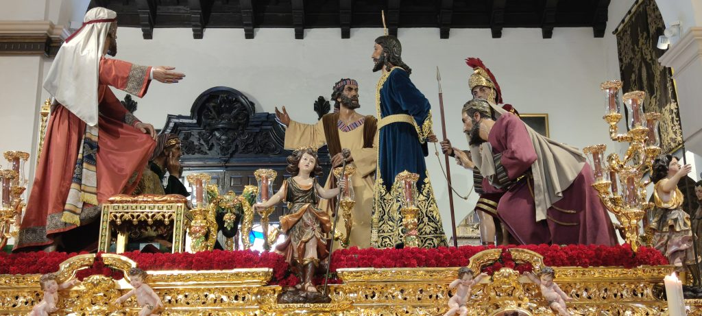 De la sobriedad de Santa Marta pasamos a la algarabía de Triana en estado puro. La Hermandad de San Gonzalo, con sus dos pasos, el misterio de Nuestro Padre Jesús del Soberano Poder antes Caifás y el palio de Nuestra Señora de la Salud, lleva la idiosincrasia trianera al centro de Sevilla. Con sus 2200 nazarenos y un tiempo de paso estimado de 75 minutos es de esas cofradías que requieren de sillita para verla. Pero merece la pena la espera.
