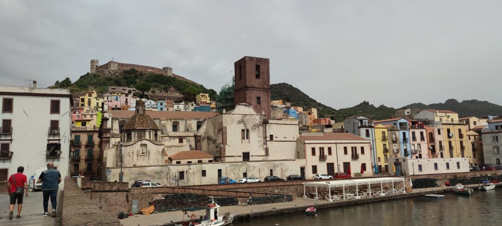 Alrededor de las 12:00 llegamos a Bosa, nuestro primer destino de este Road Trip por Cerdeña. Las mejores vistas del pueblo las vas a encontrar desde la ladera que hay frente a él. Existen varios apartaderos donde puedes dejar el coche para disfrutar de las vistas panorámicas con el río, las casas con las fachadas de colores y los restos del castillo de los Malaspina en lo alto. Tiene un centro histórico empedrado que le da cierto encanto. A nosotros, en general, el pueblo nos dejó un poco fríos. Quizás por el cansancio del viaje.